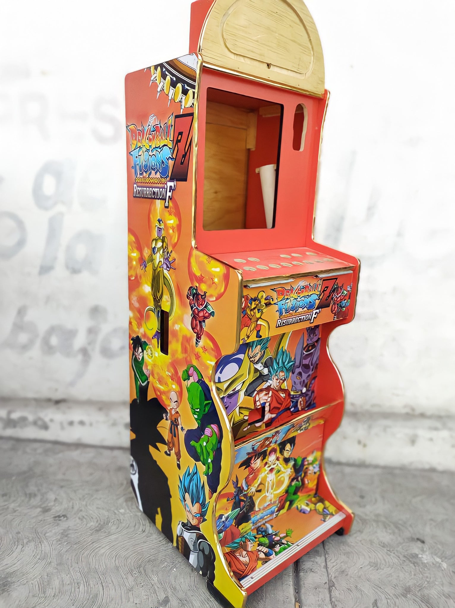 Se envía un mueble construido de pino ya con serigrafía y cortes para botones, tarjeta, monedero, acrílico y barras LED.